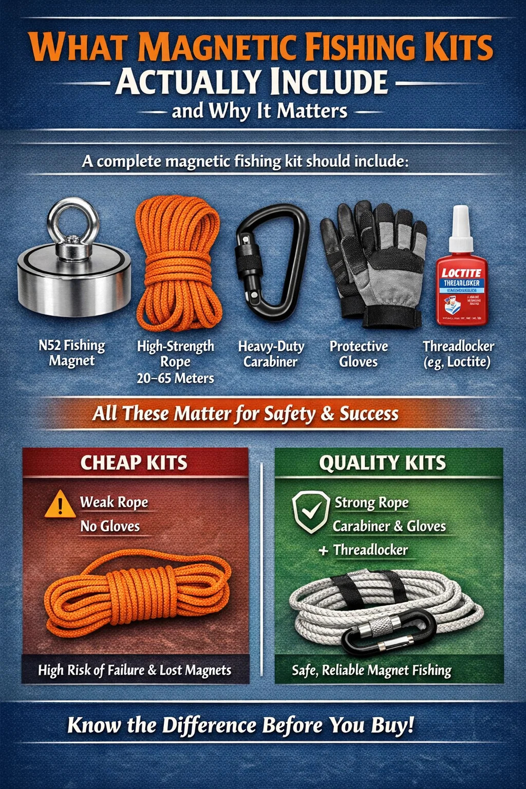 Если вы ищете прямой ответ: Полный набор для магнитной ловли включает в себя неодимовый рыболовный магнит, высокопрочную веревку (обычно 20–65 метров), карабин с замком, защитные перчатки и часто резьбовой фиксатор типа Loctite. Вместе эти компоненты определяют, будет ли ваш опыт ловли магнитом продуктивным и безопасным или разочаровывающим и опасным. Дешевые комплекты, в которых не используются перчатки или используется низкокачественная веревка, являются причиной большинства несчастных случаев и потерянных магнитов, о которых сообщается в онлайн-сообществах по ловле магнитов.