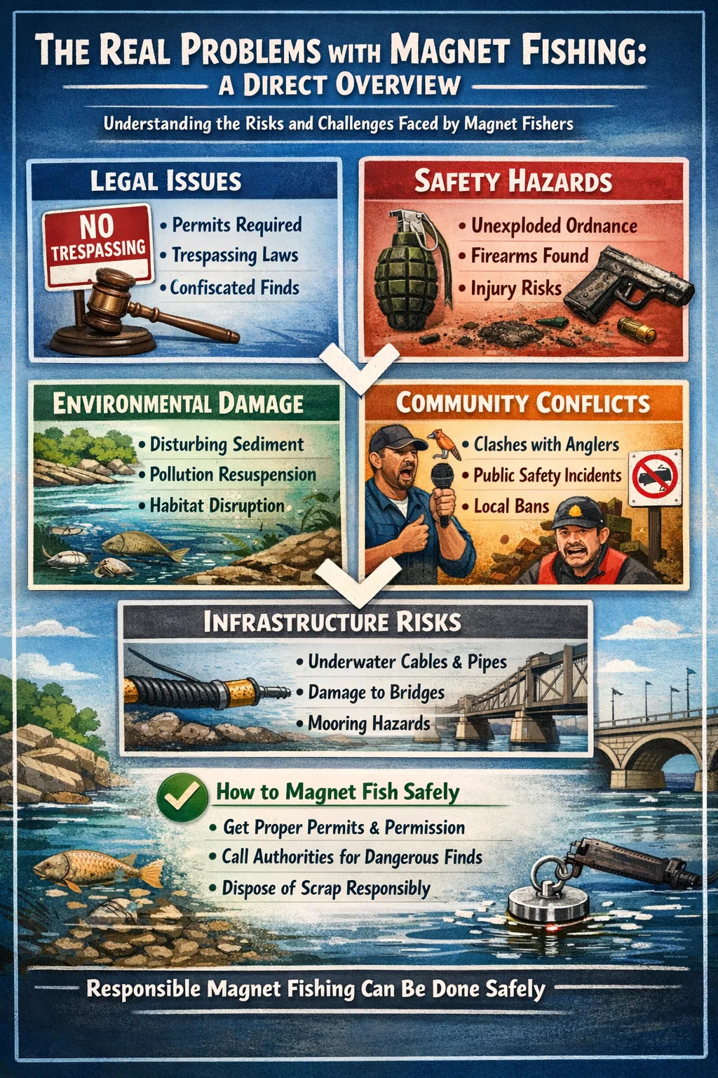 Магнитная рыбалка имеет настоящий набор проблем — и они более серьезны, чем ожидает большинство новичков. Хобби заключается в том, чтобы перетаскивать мощный неодимовый рыболовный магнит по рекам, каналам, гаваням и озерам, чтобы вытащить из воды предметы из черного металла. На первый взгляд это выглядит как безобидное занятие на свежем воздухе, и во многом так оно и есть. Но проблемы, которые с этим связаны, включают юридическое разоблачение, физическую опасность, вред окружающей среде, риски для общественной безопасности и конфликты в обществе. Ни одна из этих проблем не является гипотетической — все они привели к травмам, арестам, штрафам и публичным запретам во многих странах.