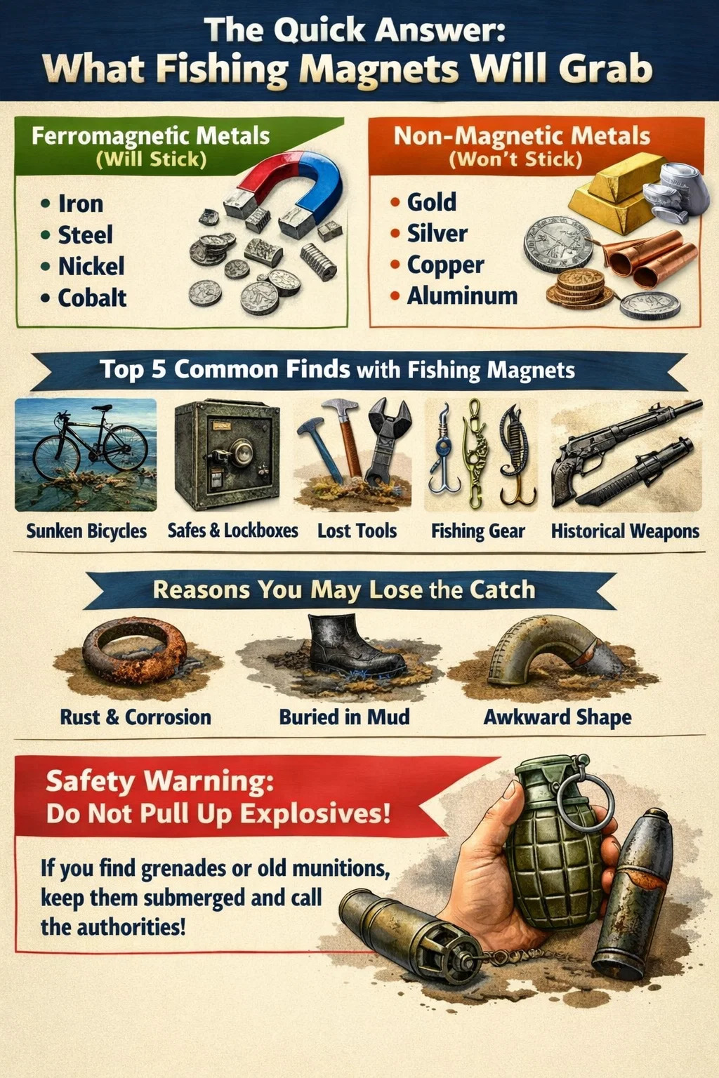 Мощный рыболовные магниты предназначены для сбора любых ферромагнитные материалы , которые в основном включают железо, сталь, никель и кобальт. В реальных сценариях это означает бесконечное разнообразие затонувших объектов, таких как велосипеды, инструменты, сейфы, монеты со стальными сердечниками, старинное оружие и промышленный лом. . Важно понимать, что они не будут собирать немагнитные металлы, такие как чистое золото, серебро, медь или алюминий.