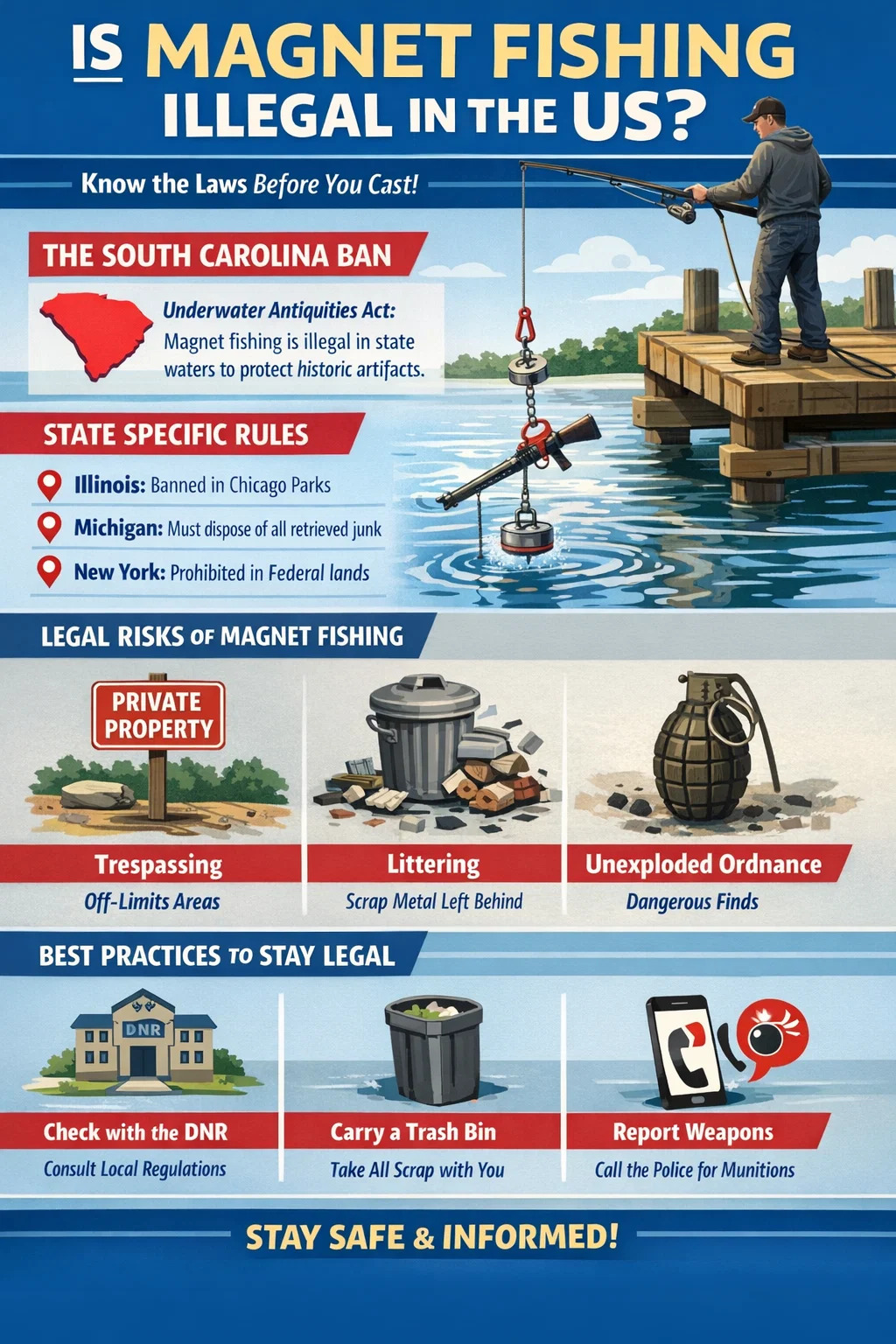 Южная Каролина — единственный штат с четким законом. Закон о подводных древностях — это делает незаконным тревожить затопленные артефакты. Потому что рыболовный магнит могут вытаскивать исторические предметы, такие как реликвии гражданской войны, государство классифицирует это как несанкционированное «спасение», для чего требуется специальная лицензия, которая редко предоставляется любителям.